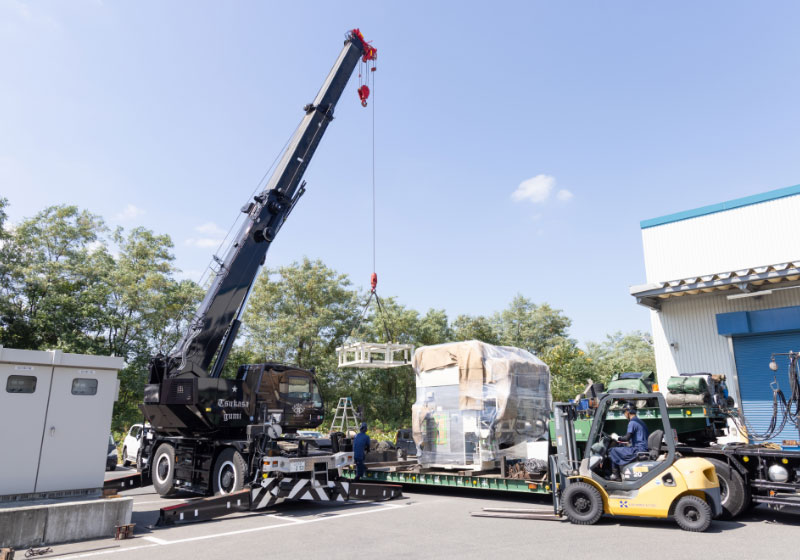 大型機械や重量物など、様々な搬入物を安全かつ正確に、ご指定の場所へ据え付けます。また、地上階だけでなく、2階や3階の上層階への搬入・据付設置工事も可能です。